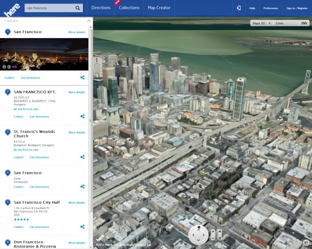 A Nokia Here térképet a magyar felhasználók számára kissé viccesen hangzó Here.net címen jelenleg is ki lehet próbálni, az oldal fő funkciói okostelefonos böngészőről is elérhetők. A rivális Google és Apple cégekhez hasonlóan a Nokia is 3D-s épületmakettekkel bővítette szolgáltatásának képességeit az Earthmine nevű amerikai cég felvásárlásával. A 3D-s nézet egyelőre korlátozottan érhető el a Nokia Here-en, például San Franciscóra keresve ki lehet próbálni - bár kevésbé látványos, mint a Google hasonló megoldása -, Budapesten viszont még csak a hagyományos műholdképes nézet érhető el.