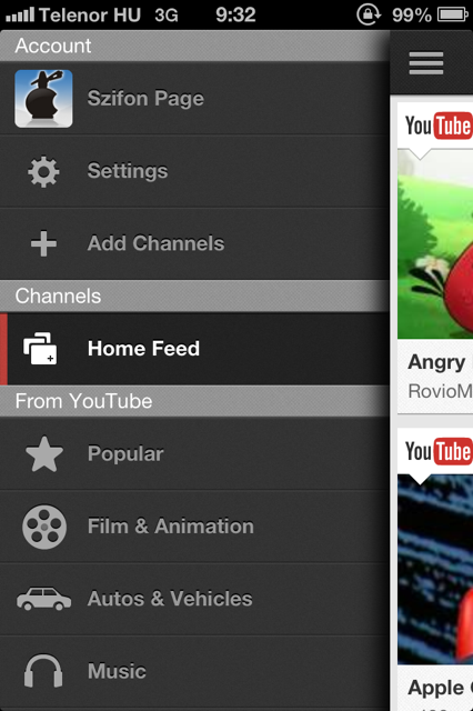 Az alkalmazás nagyon hasonlít a Facebook esetén is használt megoldásra, mivel itt is oldalt kapjuk meg a menüt, gyors, és letisztult felülettel. Ahogy azt már megszokhattuk, be tudunk lépni a saját YouTube fiókunkba, és szokásos teendőinket is elvégezhetjük.